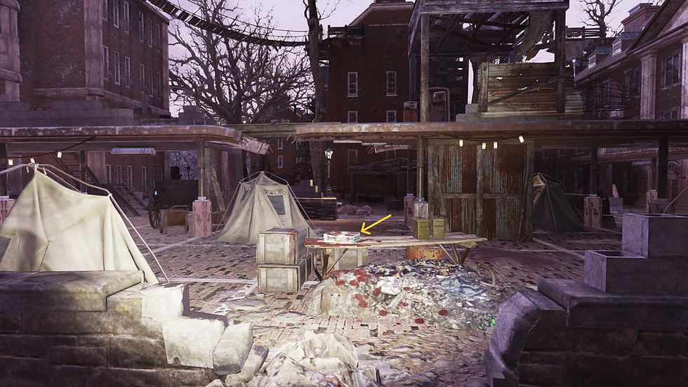 From the spawn above, exit the bus and face West. Follow the road and stop at the base of the stairs that lead up to the roof of the bus. Turn South and follow the white line on the path until you reach the broken stone wall on your right. Face West and walk straight toward the white tents. The briefcase is on the picnic table in front of you, in front of the white tent.
