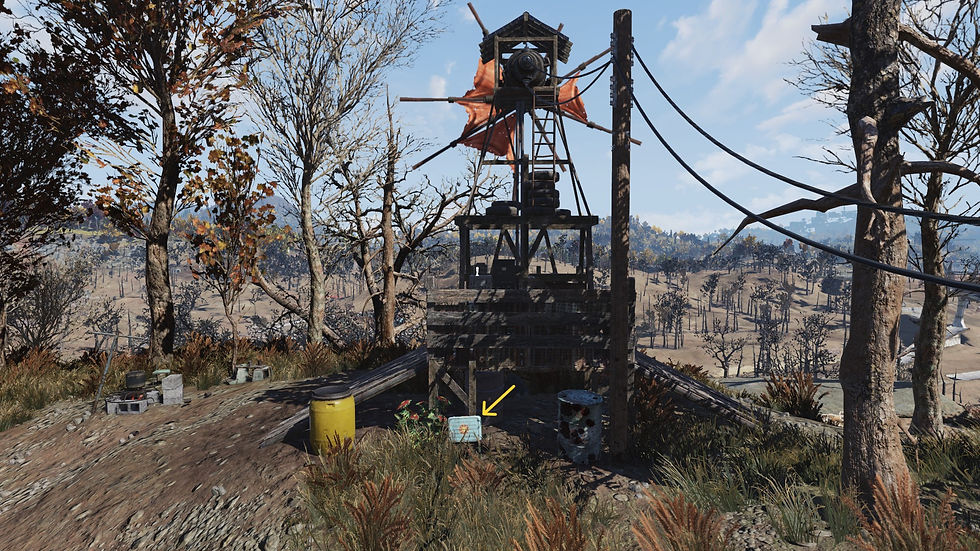 From the middle of the lead deposit, face North and follow the river bed upward. Keep to the left when you pass the tree stump on your right. At the end of the river bed, you’ll come to a small scene with a raider corpse, some brain fungus, and a few skeletons. Walk over and stand next to the raider corpse, then face West. The briefcase is on the rock in front of you, slightly to your right.