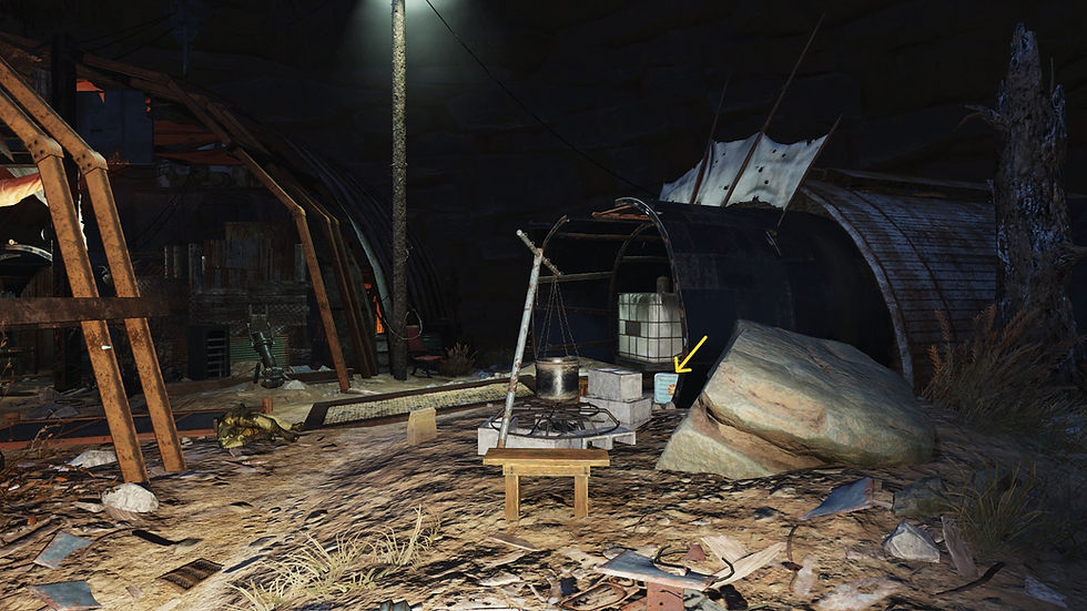 From the spawn above, face South and follow the path. Veer slightly left and continue along the path. Do not enter any of the buildings. At the end of the path, there is a gap between the fence and the rock wall. Walk through the gap, stop on the other side, and face East. Walk straight until you reach the path, then turn right. Take a few steps forward and you’ll see the briefcase inside the pipe on your right, under the skeleton.