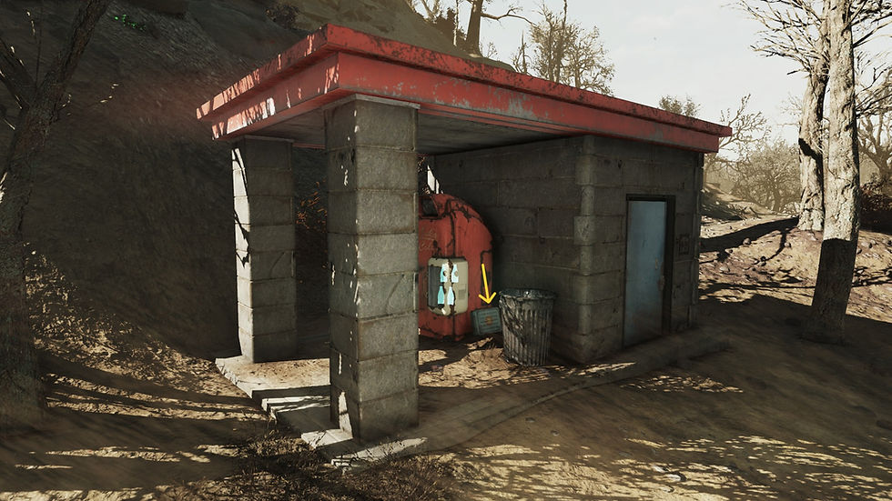 From the spawn above, face South and run straight. Jump off the ledge and land on the yellow sand path below. Face East and follow the path down the hill. The path ends at the top of a rock face. Jump off and veer right toward the small brick building with the red-edged roof. The briefcase is around the front of the building, leaning against the Nuka-Cola machine and behind the metal trash can.